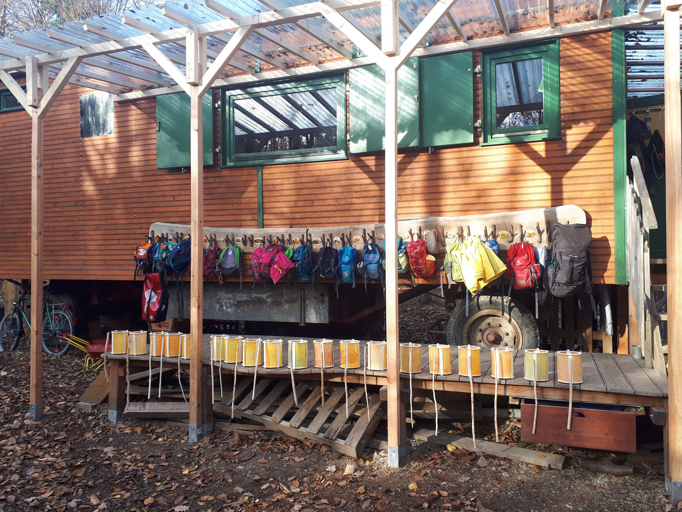 Beim Gedanken an einen Waldkindergarten haben viele Sorgen in Bezug auf schlechtes Wetter und befürchten, dass es den Kindern dann nicht gut ginge. Unsere Erfahrungen nach fast 13 Jahren Arbeit in einem Waldkindergarten und die Erfahrungen in anderen Wald- und Naturkindergärten zeigen, dass die Kinder mit schlechtem Wetter nur selten ein Problem haben. Kinder kommen in aller Regel auch dann in ein intensives, schönes und erfahrungsreiches Spiel. Und manches kann man z. B. bei Regen besonders gut machen. Wir essen dann natürlich in unserem Waldwagen und es finden verstärkt auch andere Aktivitäten im Wagen statt. Als Rückzugsraum für Kinder, die das suchen, steht die Unterkunft ohnehin zur Verfügung. Es ist uns wichtig, den Kindern die für sie wichtige Hülle zu geben. Üblicherweise denkt man, dass ein geschlossener Raum das besonders gut bietet. Als viel wichtiger erleben wir die Haltung und den Umgang der ErzieherInnen mit den Kindern, Rhythmus und die Gestaltung des Tages, der Woche und aller Aktivitäten. Zudem ist das Zusammensein vieler Kinder draußen tendentiell entspannter als in einem vergleichsweise engen Raum.
