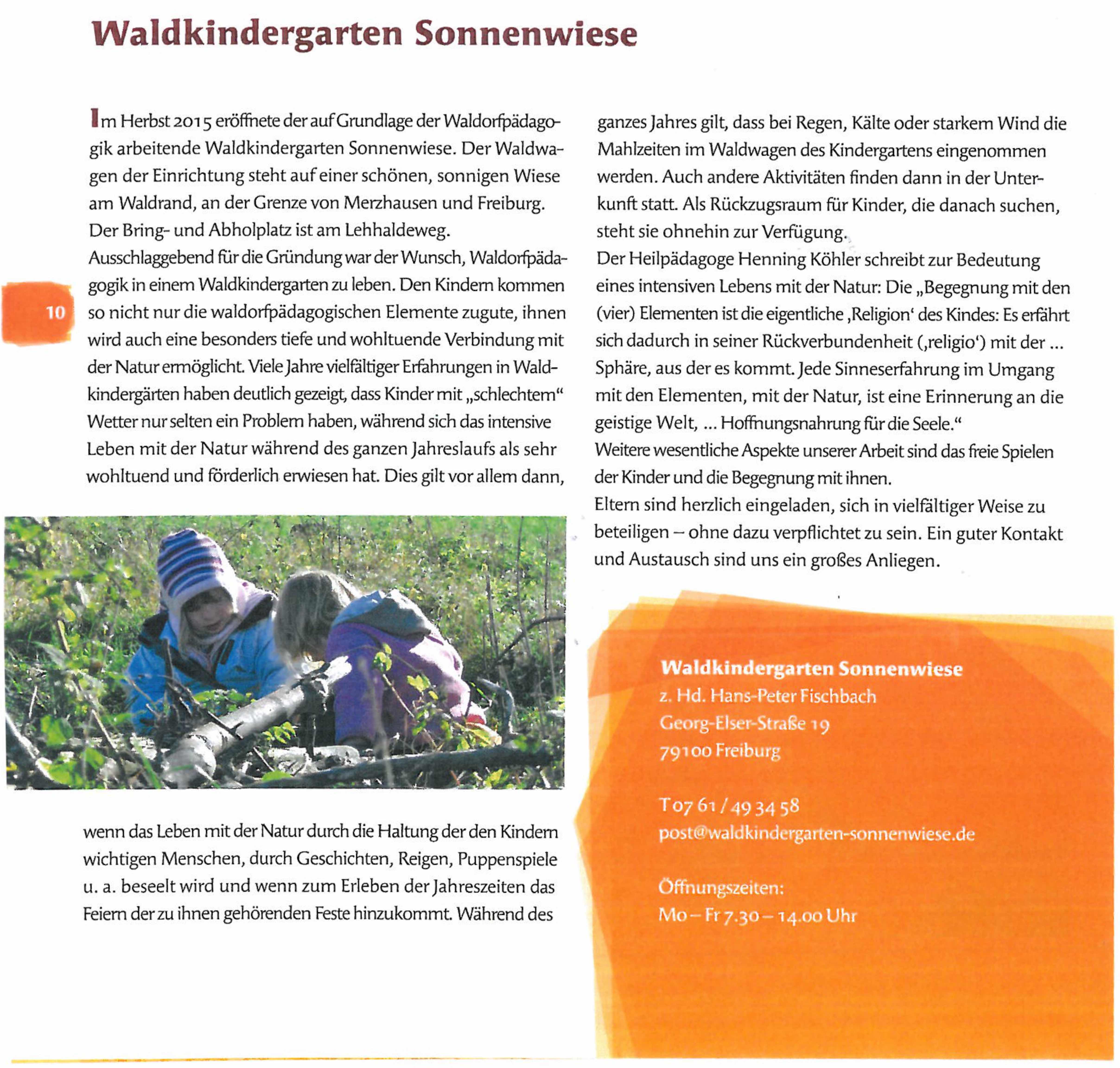 Unser Kindergarten arbeitet auf Grundlage der Waldorfpädagogik. Wir nehmen Kinder ab 2 ¾ Jahren auf. Unser Standort ist an der Grenze von Freiburg und Merzhausen, etwas oberhalb der Kreuzsteige, in der Nähe des Predigerplatzes. Der Bring- und Abholplatz ist in Merzhausen am Lehhaldeweg.